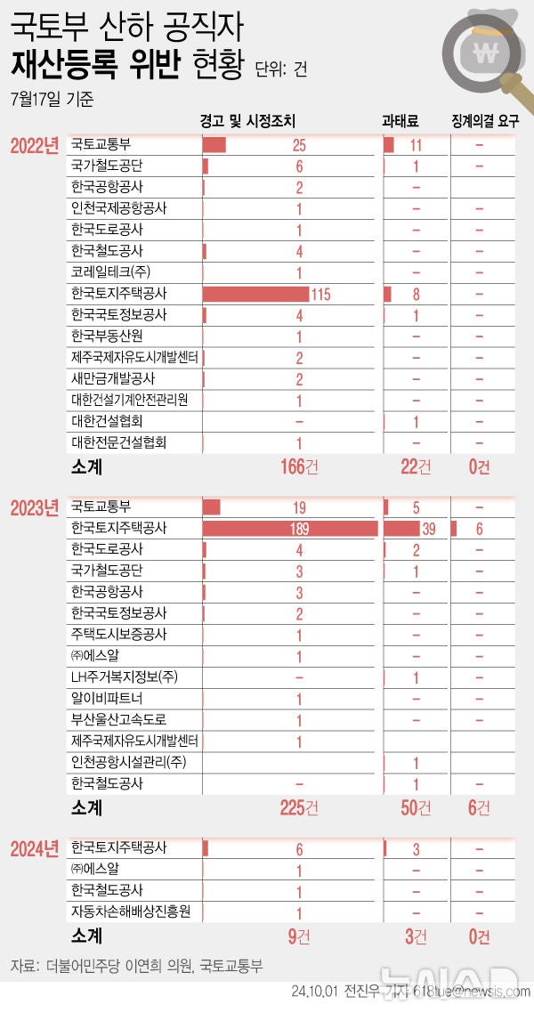 LH 직원 재산 허위신고 사건, 지난해 234명 적발…전년 대비 2배 증가• 2021년 LH 직원들의 땅 투기 사건 이후 부동산 업무를 하는 공직자들에 대한 재산등록이 의무화되었지만, 지난해 재산등록 규정 위반으로 적발된 LH 직원 수는 234명으로 전년 대비 두 배 가까이 증가했다.• LH 직원 중 6명은 징계의결 요구, 39명은 과태료, 나머지 189명은 경고 및 시정조치를 받았다.• 국토부 직원도 24건의 재산등록 규정 위반 사례가 적발되어 5명이 과태료 처분을 받고 19명이 경고 및 시정조치를 받았다.• LH는 땅 투기 사건 이전인 2021년에는 7명 임원만 재산등록 대상이었으나 2022년부터는 9000여명 모든 직원이 재산등록 대상에 포함되면서 위반 사례가 급증했다.https://n.news.naver.com/mnews/article/003/0012813279 지난해 '재산 허위신고' LH직원 234명…적발 건수 2배 ↑지난 2021년 한국토지주택공사(LH) 직원들의 땅 투기 사건 이후 부동산 업무를 하는 공직자들에 대한 재산등록이 의무화됐지만 '허위 재산신고' 등으로 적발된 LH 직원 수는 전년 대비 두 배 가까이 더 늘어난 것으n.news.naver.com