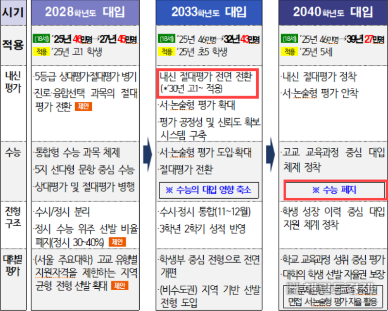 https://n.news.naver.com/article/016/0002569830?cds=news_my “수능 폐지하자! 내신도 절대평가로”…대입 파격 개편안 내놨다 [세상&]서울시교육청, 미래형 대입제도 제안 기자회견 단계적으로 대입 제도개선…2040년 수능 폐지 2028년 대입 개선안부터 내신 절대평가 도입 서·논술형 평가 확대, 외고·국제고 등 일반고 전환 서울시교육청이 ‘널뛰기 난n.news.naver.com